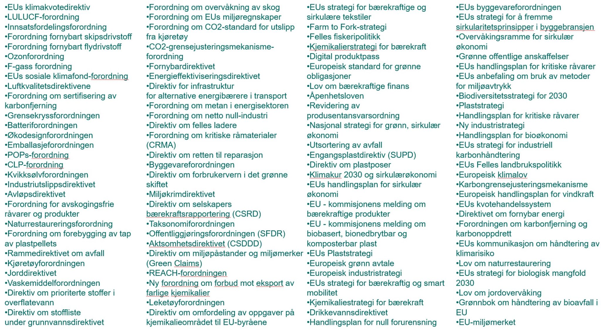 Nedenfor ser du en uoversiktlig oversikt over relevante forordninger, forskrifter, direktiver, lover og strategier som vil påvirke norske