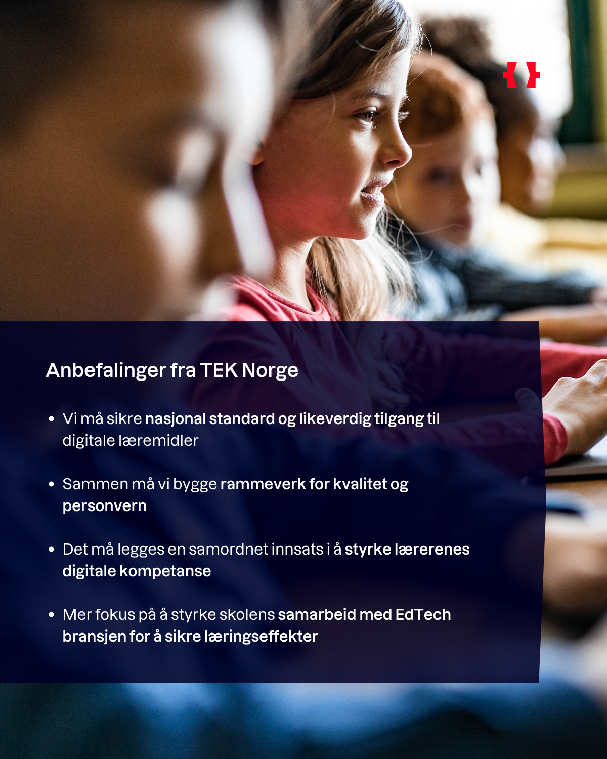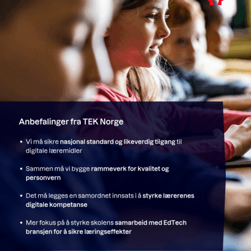 TEK Norges Edtech-forum jobber spesielt med rammebetingelser, velfungerende marked for læringsteknologi i Norge og globale eksportmuligheter. Forumet arbeider også med digital kompetanse for lærere og utdanningsledere, infrastruktur og digitale læremidler.